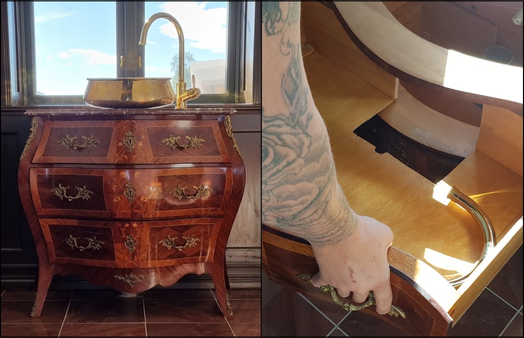 Det andra som slår en när man kommer in är den vackra byrån som vi gjort om till en vacker badrumsmöbel. Den köpte vi på Dalarnas Auktionsbyrå. Det är en byrå i rokokostil från 1900-talet. Fanerad med inläggningar i olika träslag. Nyckel finns. Skiva i röd sten. Översta lådan med stötmärken. (Höjd 80, bredd 96, djup 42). Det vi har valt att göra är att ta hål för ho och blandare. Även fått sågat ur i lådorna för vatten och avlopp men alla lådor går att använda. Den klubbades för 850 kr och detta var i början på 2020.