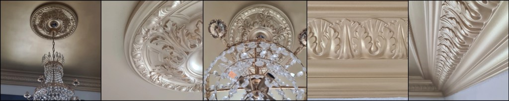 Färgen i taket är samma som vi målat guld detaljerna på vår ytterdörr. Guldtonsfäger är inte lätt att hitta som ger en mera naturlig känsla. Provköpte flera olika sorter och testmålande men till slut hittade vi denna hos Becker. Det är en metallfärg som är en halvblank vattenburen grund- och täckfärg av hög kvalitet som används inomhus. Beckers kallar den Decor Metall.