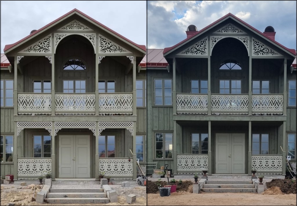 Bilden ovan ser ni till vänster hur vi funderar på att slutresultat ska bli. Bilden till höger är hur det ser ut idag. Jag har även önskemål om att vi ska sätta en svarvad kula i mitten på runden uppe på balkongen. Något som är en fördel att hålla sig till samma färg på ett hus är att du kan gå bananas utan att det blir för mycket. Nu är det samma färg på huset och snickarglädjen men snickarglädjen har mera vitt i sig. Detta var inte tänkt från början men något Mattias fick strida med ett tag men glad att han gjorde. Det ramar verkligen in var entrén är på huset.