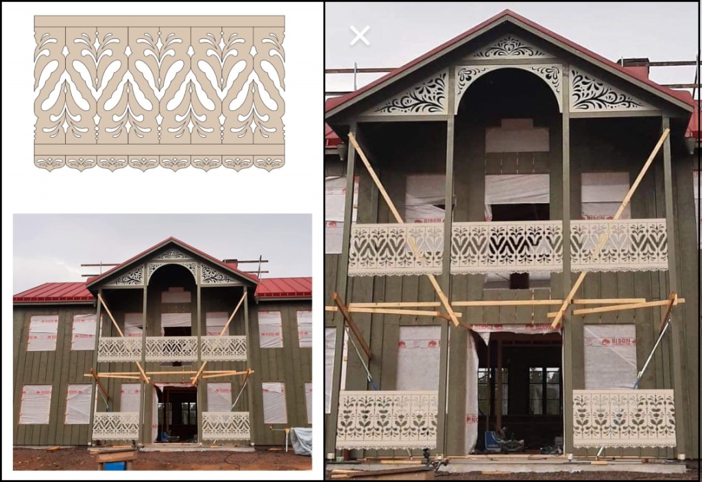 Det jag fastnade för var detaljen ni ser ovan på bilden till vänster, dekorationen under staketet. Det var något som måste finnas med. Sen är vi i dalarna så motivet bör efterhärma kurbits för att anknyta till platsen. Mattias har en tatuering på armen som har inspirerat mig till de olika räckena. Något jag själv inte hade lagt märke till är att många hus har olika räcken på de olika våningsplanen men det var något Mattias önskade och jag föll snabbt för den idén. Det är fint med en mera fyll nere och en som ger ljusinsläpp uppe. Både för att avdela på huset men även få in mera ljus till vardagsrummet uppe. När man även sitter på balkongen är det lättare att se igenom. Nere med ett mera fyllt staket håller det snö borta.