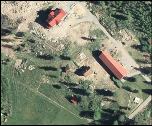 Om vi backar i tiden och hamnar i tiden när gården bedrevs som en gård fanns det ett bostadshus som jag märkt upp som en röd rektangel nedan. Den blå byggnaden jag ritat ut var ett stall. Vid den gula rutan fanns det en smedja. Det har även funnits två stycken härbren. För att ha en fungerande gård med djur förstår jag varför man tryckte ihop alla byggnader fast man hade stor mark. För idag när man glömt något hinner man bli helt slut innan man gjort det som tanken var.