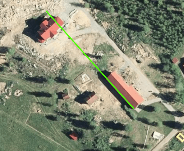 För att få huset att kännas som det alltid stått där var det viktigt att det samspelar med resterande byggnader. Och då vi valt att endast ha kvar ladan utgick vi ifrån placeringen av denna. Men den står inte ”rakt” på tomten utan snare snett. Jag och Mattias satt ett snöre så som jag dragit strecket nedan. Så husets stora del livar med ladugården. Sedan ger utbyggnaderna fin proportion till gårdens bredd. Det var mycket nervöst att mäta ut själva vart huset skulle ligga. Hade vi tagit in någon som måttat ut det åt oss hade det ju varit lite lätte men det blev ett ekonomiskt beslut att ställa ut huset hörn själva. Med tanke på att vi använt ett rep och fluktat tills oss platsen är jag mycket nöjd med placeringen av huset.