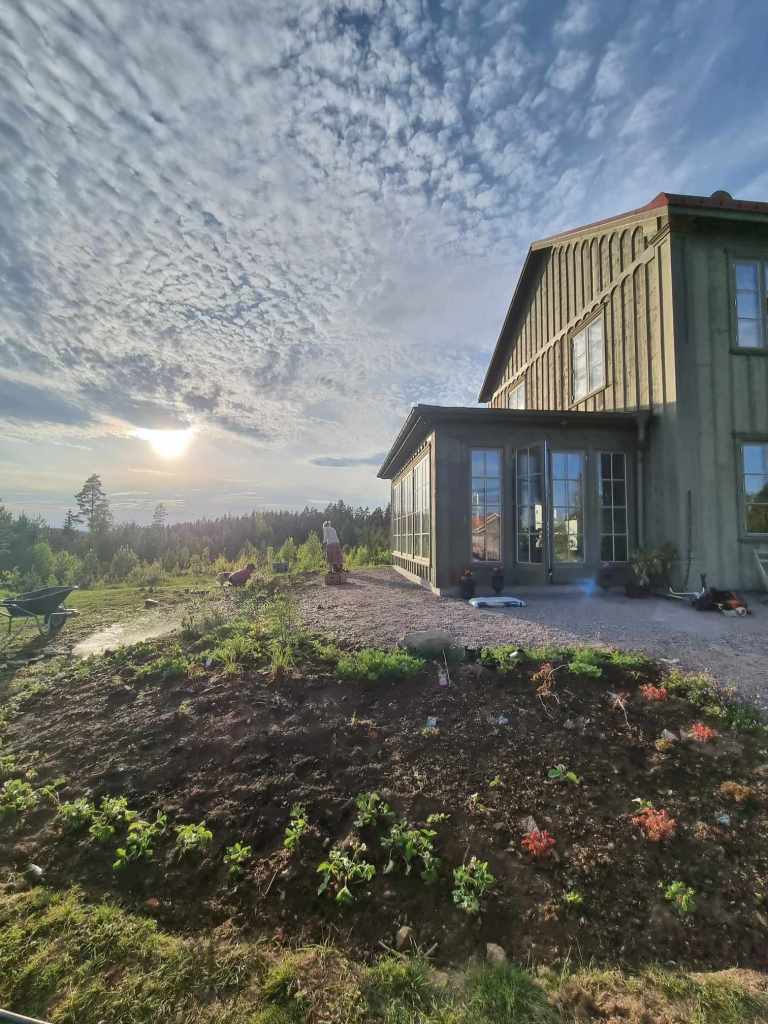 Trädgården har fått 9 nyplanterade äppelträd och fått ett stort grönsakslandland. Har skapat två stycken potager där vi kan njuta av blommor och de vackra grönsakerna. I år kommer vi även sattsa på en stor dahlia rabatt där vi sakta men säkert bygger upp en grund till ett vackert växthus. Grunden bygger vi av gården stenar vi gräver upp. Rabatterna uppe vid huset ligger på dryga 200 kvadratmeter tillsammans, vilket är en stor utmaning.