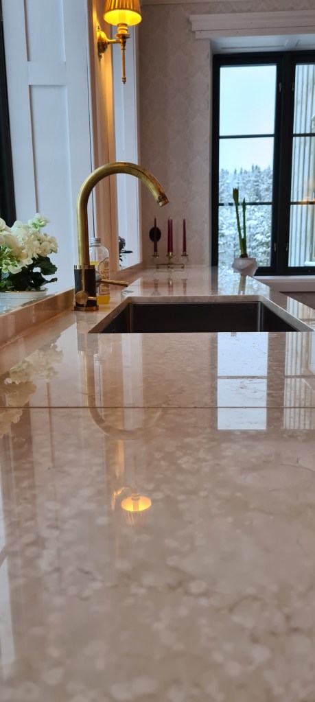 En stor skönhet är våra bänkskivor i köket. Botticino är en klassisk beige, varm marmor med fin ådring. Denna vackra polerade sten köpte vi hos Wasasten i Älvdalen. De har även hjälpt oss med många vackra stenar till huset. Så som det vackra kalksten golvet som beklär köket och vidare ut i hallen.