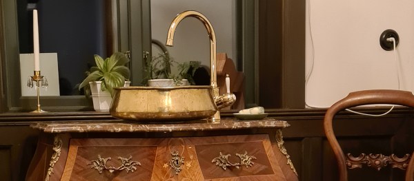 Handfatet har även en vacker ho i mässing som vi köpt över en webbutik. Blandaren är från Damixa. Den räknas som en köksblandare och vi valde den utan diskmaskinsavstängning. Den är i polerad mässing och har ett vitt porslingrepp. Tycker den passar bra in. Det vita på handtaget plockas upp av toalettens porslin.